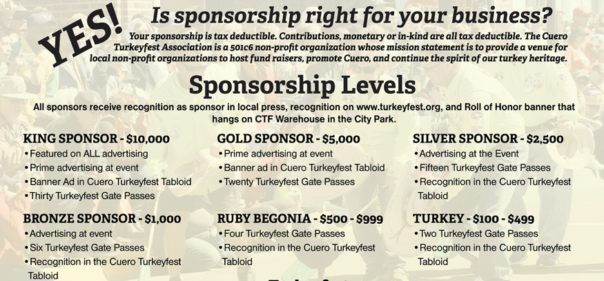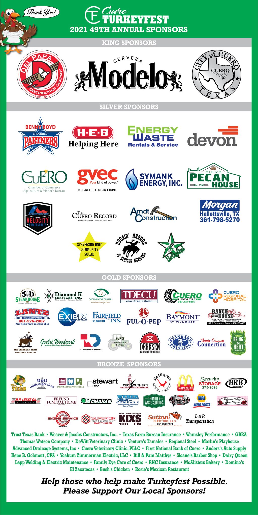 The Cuero Turkeyfest Association is comprised of citizens that share a common mission to give back to the community through directing this annual affair. All board members are unpaid volunteers that work countless hours to make sure that the Cuero Turkeyfest is planned, set up, orchestrated, and put away again each year, on time. If you happen to see one of them running around the festival grounds, and they have time to stop, be sure and give them a big high-five.