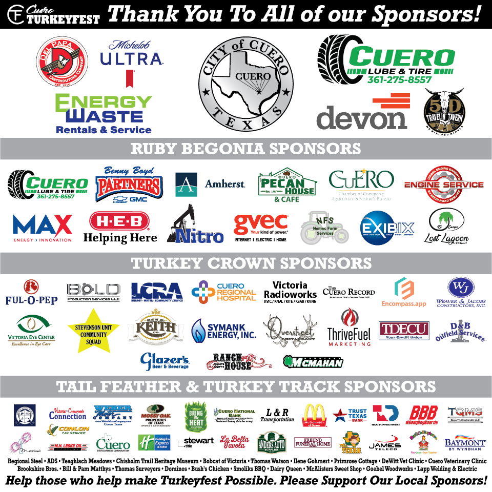 The Cuero Turkeyfest Association is comprised of citizens that share a common mission to give back to the community through directing this annual affair. All board members are unpaid volunteers that work countless hours to make sure that the Cuero Turkeyfest is planned, set up, orchestrated, and put away again each year, on time. If you happen to see one of them running around the festival grounds, and they have time to stop, be sure and give them a big high-five.